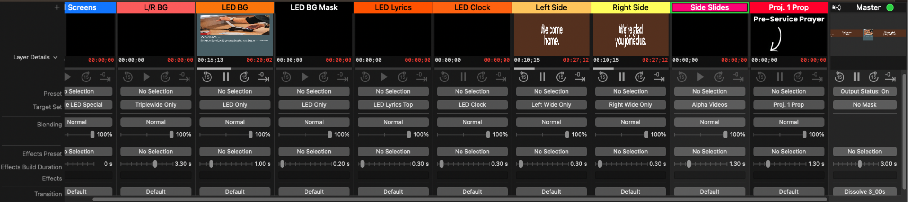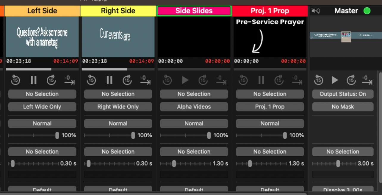 You can faintly see the Pre-Service Prayer arrow in the bottom left of the above image. It's not part of the video being played, which is coming from the Left Side layer. Instead, it is coming from the Proj. 1 Prop layer, which going back to our sticky note analogy, is a sticky note placed in the bottom left of our big canvas.